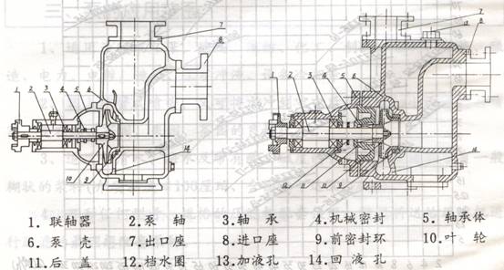 在一些泵的軸承體底部還設(shè)有冷卻室。當(dāng)軸承發(fā)熱引起軸承體溫升超過(guò)70℃時(shí),可在冷卻室處通過(guò)任意一只冷卻液管接頭,注入冷卻液循環(huán)冷卻。泵內(nèi)部防止液體由高壓區(qū)向低壓區(qū)泄漏的密封機(jī)構(gòu)是前后密封環(huán),前密封環(huán)裝在泵體上,后密封環(huán)裝在軸承體上,當(dāng)泵經(jīng)長(zhǎng)期運(yùn)轉(zhuǎn)密封環(huán)磨損到一定程度,并影響到泵的效率和自吸性能時(shí),應(yīng)給予更換。
